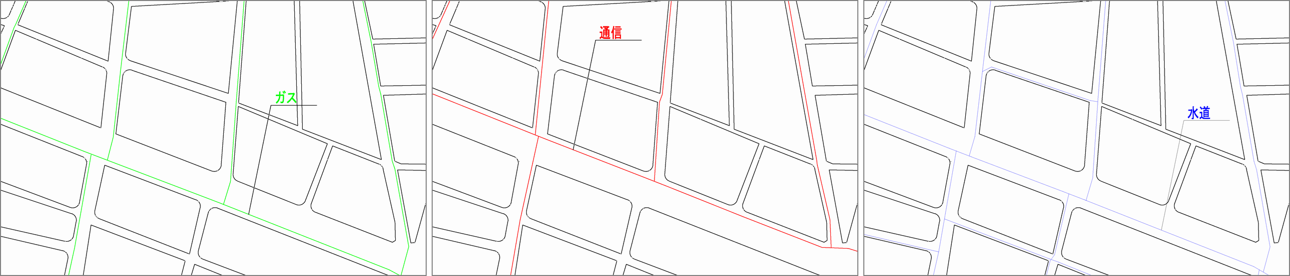 地下の工事を行うにあたり、初めに、対象場所の地下にインフラ網がどう張り巡らされているのか確かめる必要があります。 各インフラの事業者に問い合わせを行い、どのような配管になっているか資料を請求します。また、対象地域を管轄している事業者(例:水道局)に出向いて台帳を調べる事もあります。(※非破壊検査にて地中調査ができるスクリーニング機器を販売する技研会社等も存在しますが、ここでは省略します)