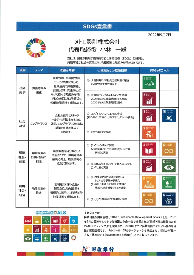 阿波銀行さんのSDGs取組宣言企業のページに、2022年9月15日付で当社のSDGs宣言書が掲載されました。